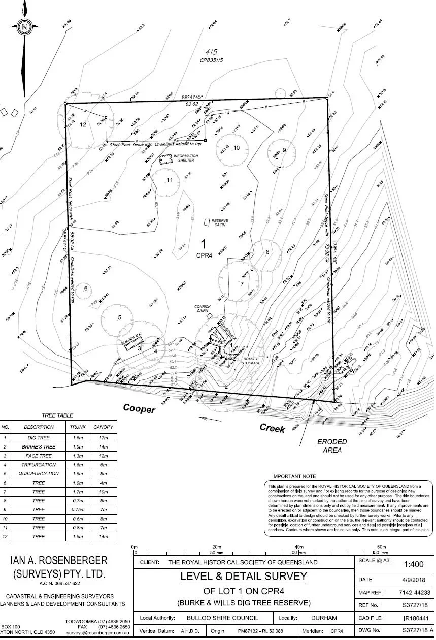 The land surrounding the icon trees is under the trusteeship of the RHSQ and located within the 7275 square kilometre Nappa Merrie property owned by Morella Agriculture, a family business operated by the Coulton family. The Reserve was first gazetted in 19642 covering about one acre. Following a further survey in the site was gazetted in 19873 as R7 being lot 1 on plan CPR4 an area of 4470 square metres in the Parish Oontoo, County Cooper, on the bank of Cooper Creek in south-west Queensland (Attachment 1).